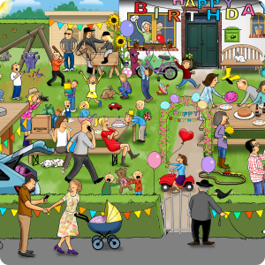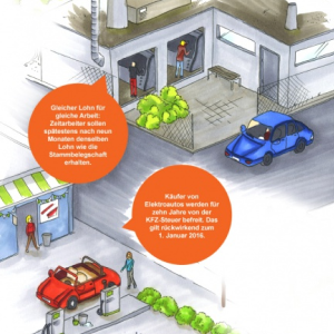 Gezeichnet werden sollte eine Szenerie einer fiktiven, mittelgroßen, deutschen Stadt, eingebettet in eine Landschaft mit Himmel. In das Bild eingefügt werden sollten einzelne politische Maßnahmen als Sprechblase.