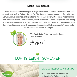 Das Newsletter-Design sollte für einen Online-Versand-Handel mit Schwerpunkt auf Bio Bettwaren gestaltet werden. Das sanfte Grün des Corporate-Designs sollte auch in der Gestaltung des Newsletters Verwendung finden.